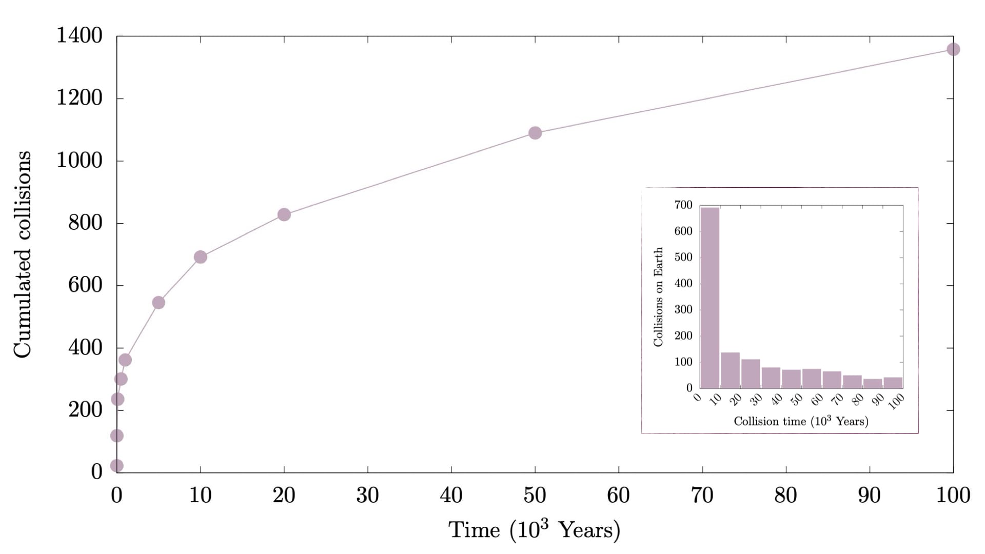 The team were able to conclude that, following lunar impacts, Earth collects about 22.6% of the ejected material over 100,000 years, with half of these collisions occurring within the first 10,000 years. The collision rate follows a power-law distribution over time (a relationship where a change in one quantity results in a proportional relative change in another) independent of the initial size of those quantities. Material launched from the Moon's trailing side has the highest Earth collision probability, while the leading side produces the lowest. When hitting Earth, lunar ejecta travel at 11.0-13.1 km/s and predominantly strike near the equator (with 24% fewer impacts at the poles). These impacts are nearly symmetrically distributed between morning and evening hours, peaking around 6 AM/PM.