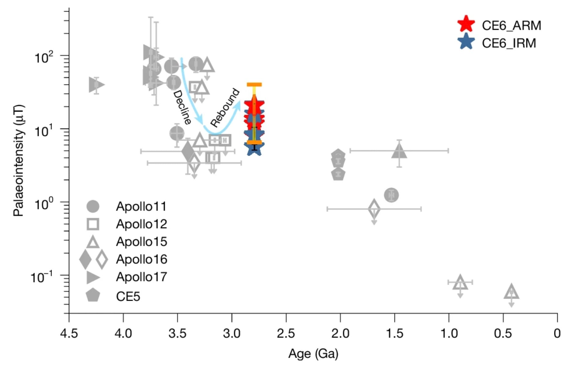 These results record a rebound of the field strength after its previous sharp decline of around 3.1 Ga [billion years ago], which attests to an active lunar dynamo at about 2.8 Ga in the mid-early stage and argues against the suggestion that the lunar dynamo may have remained in a low-energy state after 3 Ga until its demise.