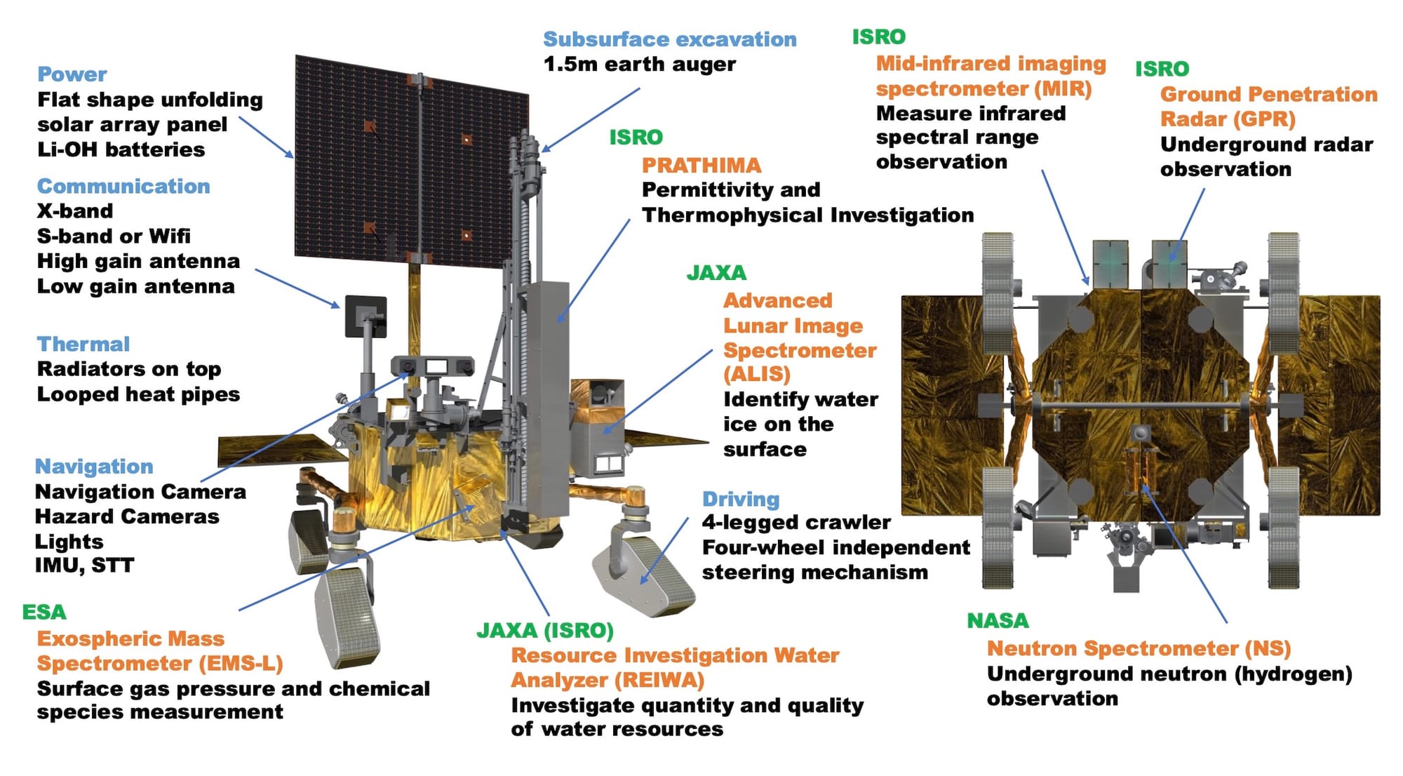 For the upcoming joint Indo-Japanese Chandrayaan 5 / LUPEX mission to drill and analyze water ice on the Moon’s south pole, JAXA and Mitsubishi have continued validating and refining the LUPEX rover and instruments designs through a series of tests using qualification and engineering models. The sophisticated rover, whose mass has increased from 350 kilograms to 420, will be delivered to the Moon by a lander being made by ISRO. The lander will be launched on the heavy-lift Japanese H3 rocket. The rover will feature instruments from both Japan and India, with a contribution each from NASA and ESA. The joint mission targeting launch by end of decade will bring a giant leap in lunar capabilities for both ISRO and JAXA, and can provide NASA with data critical for Artemis planning currently missing from US missions. An abstract co-authored by various mission team members describes specific milestones achieved or in progress for each LUPEX instrument.